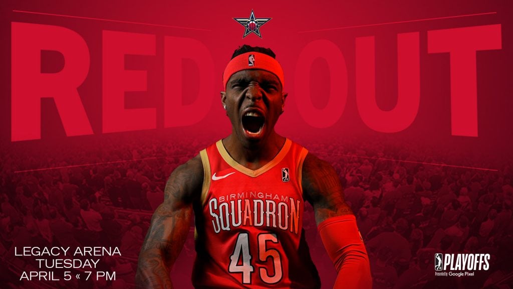 The Squadron are hosting a “Red Out” at Legacy Arena for the franchise’s first-ever playoff game Tuesday. The first 2,000 fans will receive a red t-shirt courtesy of the Squadron.