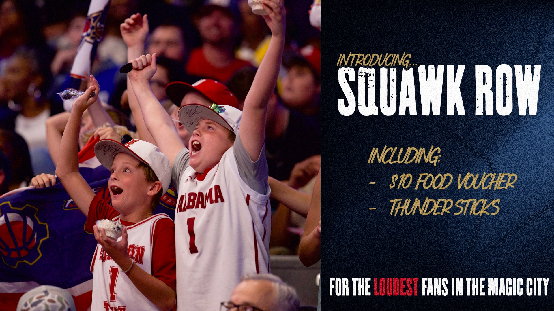 This season, the Squadron are excited to introduce Squawk Row — a new cheer section for the loudest fans in the Magic City. This area is positioned right behind the visiting team's bench — making it easy for them to enjoy every squawk, clap, yell and chirp from our most passionate fans. Thunder sticks and a $10 food voucher are included with every ticket purchased in this section.